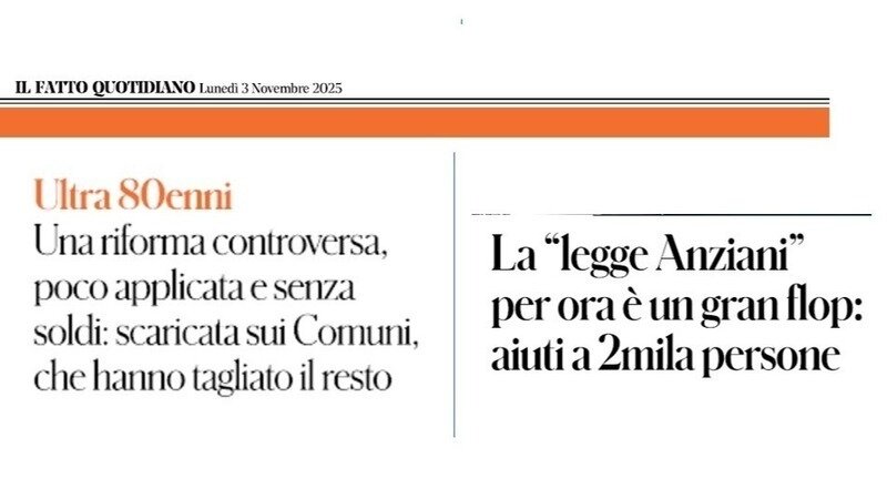 L’articolo di Gaia Scacciavillani del 3 novembre scorso su il Fatto Quotidiano è difatti molto esplicito già dal titolo: “LA "LEGGE ANZIANI" FINORA È UN FLOP: gli aiuti sono arrivati solo a 2mila persone”.