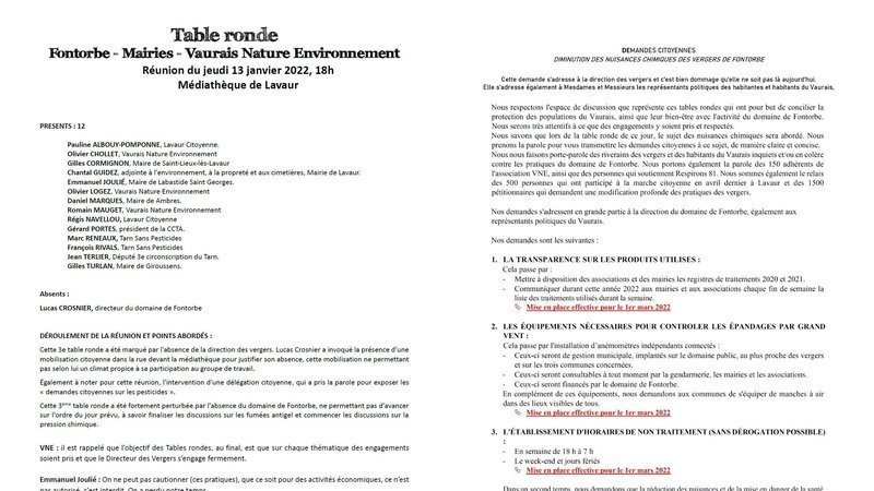 Suite à l’inquiétude des riverains des Vergers de Fontorbe, préoccupés par les «pratiques toxiques» du domaine, notre association a initié depuis le mois de septembre 2021 des tables rondes de concertations, réunissant les maires des communes impactées, le député, le président de la Communauté de Communes, la direction des vergers et notre association, représentante des habitants du Vaurais.