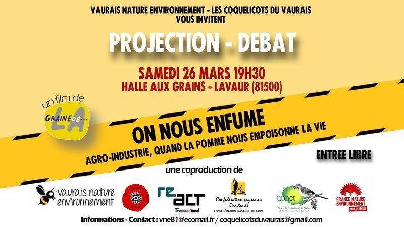 « On nous enfume » un film de La Graine de..., produit par Vaurais Nature Environnement, ReAct Transnational, la Confédération Paysanne du Tarn et d'Occitanie, l’Union pour la Protection de la Nature et de l’Environnement du Tarn et France Nature Environnement Midi-Pyrénées.