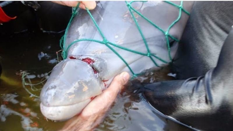The dolphin in the attached photo was not caught in a mesh net but similar damage and death can occur with gill nets.