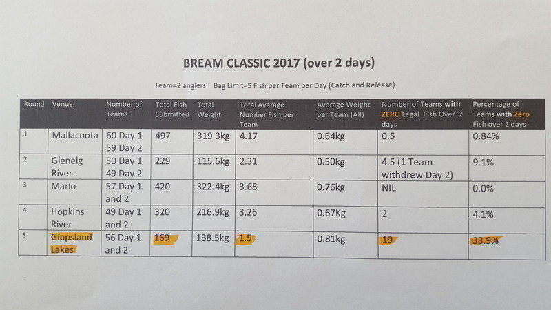As a measure of the state of the Gippsland Lakes Bream fishery we have attached a breakdown of the catch for 2017. The fact that 56 teams of two fishers, i.e. the best of the best amateurs, could catch only 1.5 legal fish over the 2 days in the Gippsland Lakes, with 19 or 33.9% catching NO fish. This is a damning reflection on the state of the fishery.