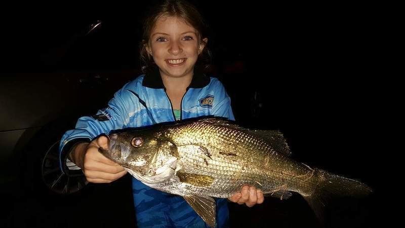 Photo of a happy fisher with her catch of an Estuary Perch courtesy of Peter Erwin