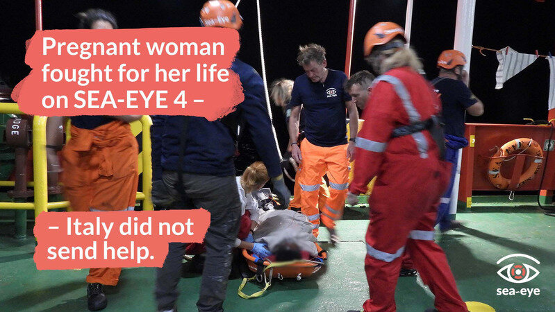 After a rescue operation on Friday morning, a woman fought for her life for hours on the SEA-EYE 4. Our head of mission had asked the Italian Maritime Rescue Centre several times for an urgent medical evacuation. Each time, however, Italy referred to the Libyan Maritime Distress Control Centre and Italy's telemedicine service.