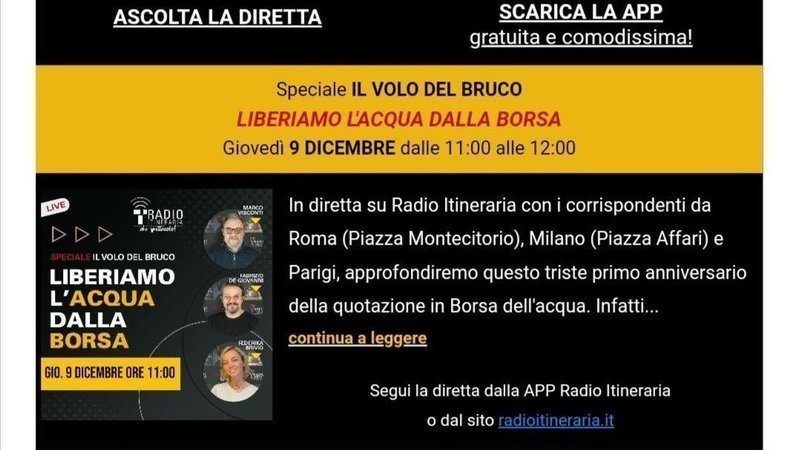 Giovedì 9 dicembre dalle ore 11 alle 12 Radio Itineraria sarà in diretta con lo Speciale “LIBERIAMO L’ACQUA DALLA BORSA”, condotto da Fabrizio De Giovanni e Marco Visconti, in collegamento con Piazza Affari a Milano e Piazza Montecitorio a Roma. La giornalista Giada Santana, da Parigi, riporterà agli ascoltatori le voci degli attivisti che hanno dato vita alle manifestazioni di Parigi, Bruxelles e Montreal.