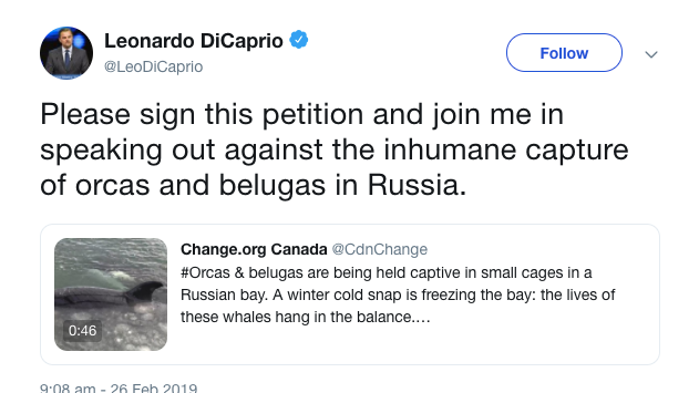 Ieri Leonardo Di Caprio ha condiviso la petizione sul suo profilo Facebook e Twitter e ha chiesto ai suoi follower di firmarla e condividerla. Due giorni fa Pamela Anderson ha chiesto che il presidente russo si attivi subito per liberare questi animali.