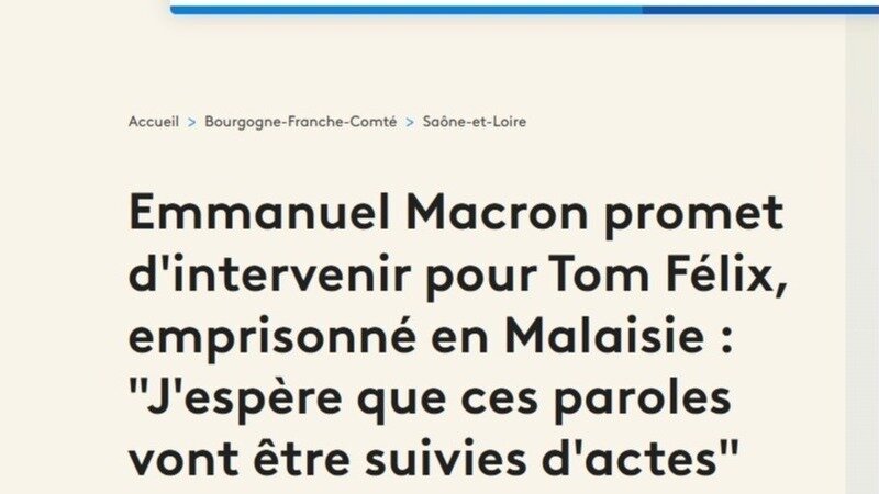 Nous avons une avancée majeure à partager avec vous : Sylvie et Jean-Luc Félix, les parents de Tom, ont récemment rencontré Emmanuel Macron pour plaider la cause de Tom, injustement emprisonné en Malaisie. Lors de cet entretien, le président de la République a exprimé son engagement à intervenir politiquement pour obtenir sa libération. Les parents de Tom espèrent « ces paroles vont être suivies d’actes » . (Article France 3)