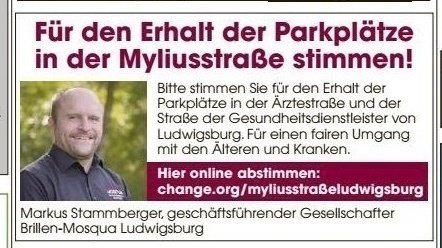 Petition updateParkplätze in Ärztestraße erhalten - alles andere wäre egoistisch gegenüber Betroffenen!Heute auf dem Titel des Ludwigsburger Wochenblatts