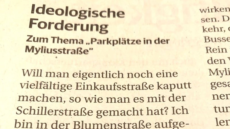 Heute sind in der LKZ zwei Leserbriefe zum Thema „Parkplätze in der Myliusstraße“, die die Meinung nahezu aller wiedergeben, die uns in den letzten Wochen auf das Thema angesprochen haben. Ein Anwohner kommt auch zu Wort und sagt: „Die Myliusstraße ist ein Beispiel dafür, wie stressfreies Miteinander funktioniert!“ Das stimmt, alles andere als Chaos in der Myliusstraße! Er muss es wissen, er wohnt in der Myliusstraße!