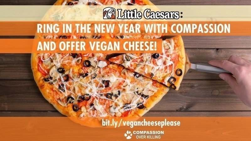 TODAY: Join our tweetstorm encouraging @LittleCaesars to ring in the New Year with compassion by adding vegan cheese to its line-up -- simply click below to use our sample tweet! The market for plant-based foods is soaring, and pizza chains are seizing the opportunity to bring home the dough: Pizza Hut recently debuted vegan cheese Violife at select locations in the UK--and then quickly began dishing it out nationwide because of massive demand! US chains like Mellow Mushroom and Pieology are already offering the dairy-free delight, too, and according to international restaurant consultants Baum + Whiteman, 2018 will see the widespread adoption of vegan cheese on pizza and burger chain menus. There’s no better time than the New Year for Little Caesars, one of the largest pizza chains in the US, to help pave the way for this plant-based revolution and get a slice of this growing market. Join us in tweeting @LittleCaesars TODAY for vegan cheese --- click this link (https://ctt.ec/V9wKc) or copy and paste our sample below! SAMPLE TWEET: Ring in the New Year with compassion, @LittleCaesars! @PizzaHutUK now offers dairy-free cheese, which will take menus by storm in 2018. Now is the time to get a slice of the action--offer #vegan cheese! bit.ly/vegancheeseplease via @TryVeg Thanks for helping us take a slice out of cruelty, and have a happy New Year!