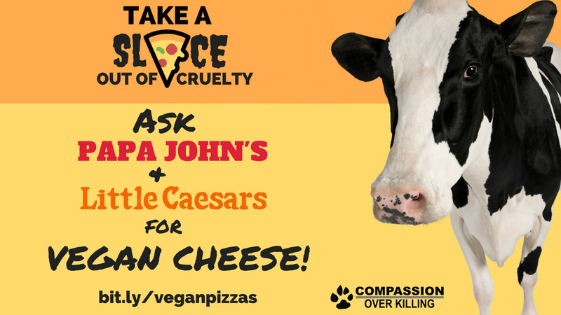 Tens of thousands of you have asked Little Caesars and Papa John’s to take a slice out of cruelty by offering an alternative to dairy-based cheese. Keep up the pressure: these chains now need to see this demand through direct customer feedback. Let them know you want vegan cheese TODAY by submitting a quick comment on our simple web form (http://bit.ly/veganpizzas)!