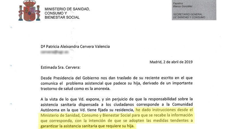 “(…) He dado las instrucciones desde el Ministerio de Sanidad, Consumo y Bienestar Social para que se recabe la información que corresponda, con la intención de que se adopten las medidas tendentes a garantizar la asistencia sanitaria que requiere su hija”