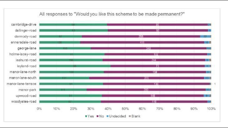 They also report on the responses from residents and the chart shows that there is clearly a large majority of residents who do not wish the LTN scheme to be made permanent. So much for the claims that LTNs are popular with residents.