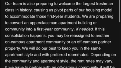 Thursday, June 18, upperclassmen residing in East and West Campus Apartments received an email from LSU Residential Life stating that “Our team is also preparing to welcome the largest freshman class in history, causing us to pivot parts of our housing model to accommodate those first-year students. We are preparing to convert an upperclassman apartment building or community into a first-year community, if needed. If this consolidation happens, you may be reassigned to another on-campus apartment community or an off-campus partner property...” “Depending on the community and apartment style, the rent rates may vary”. Simply put, the University notified the upperclassmen that if necessary, they will be removed from their on-campus housing in order to accommodate the “largest freshman class in history”.There are several issues with this, the first one being that this violates the Housing Contract, where upon signing, and paying the $250 deposit the students living in East Campus Apartments, and West Campus Apartments “have a 9 month contract and may remain between the fall and spring semesters when classes are not in session.” Section 3.b.ii-iii. The $250 deposit that they pay ensures that their spot will be held.