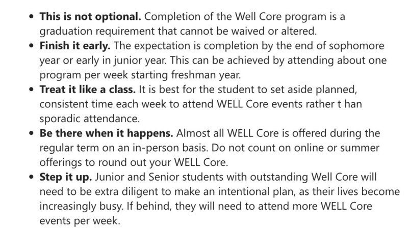 "The purpose of WELL Core is to nurture in each student the capacity to live a life that is satisfying, with a sense of meaning and purpose, encompassing all dimensions of human life. In order to graduate students are required to earn a total of 50 Well Core credits (adjusted for transfer students), 5 in each of the following categories: Intellectual, Occupational, Financial, Cultural, Spiritual, Physical, Environmental, Emotional, and Service.”