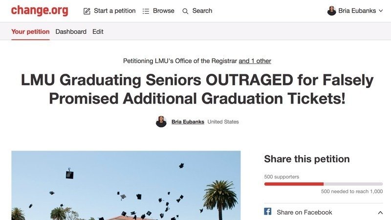 Petition updateLMU Graduating Seniors OUTRAGED for Falsely Promised Additional Graduation Tickets!500 signatures in counting!!