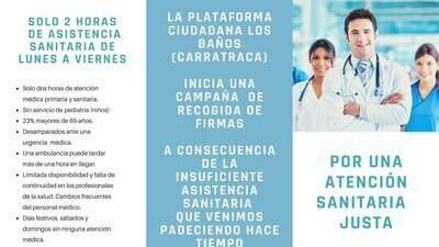 1. Limitada disponibilidad de asistencia sanitaria: Actualmente, Carratraca cuenta con una asistencia sanitaria que se presta solamente durante dos horas al día de lunes a viernes. Esta restricción horaria hace que sea extremadamente difícil para los residentes acceder a la atención médica cuando la necesitan. Esta limitación plantea un riesgo significativo para la salud de nuestros ciudadanos, ya que las emergencias médicas pueden ocurrir en cualquier momento y esto se une la gran demora en la espera de asistencia sanitaria por parte de los Servicios de Urgencias que, en algunos casos, se ha demorado más de una hora la espera por una ambulancia medicalizada.