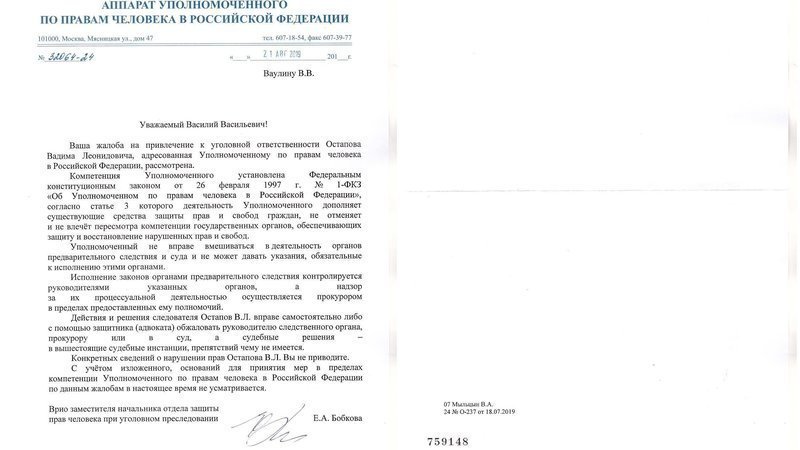 Сегодня получил письмо из Аппарата уполномоченного по правам человека в Российской Федерации на мою просьбу подключиться к проверке обоснованности выдвинутых против Вадима Остапова обвинений в убийстве.