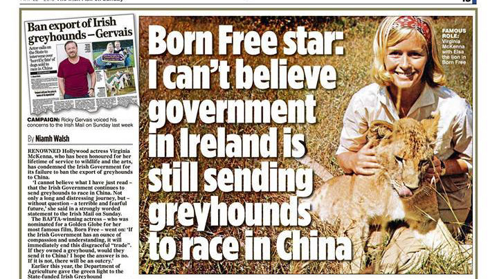 In a report in the Irish Mail on Sunday (22nd May 2016), the star of Born Free stated: "I cannot believe what I have just read - that the Irish Government continues to send greyhounds to race in China. Not only a long and distressing journey, but - without a question - a terrible and fearful future."