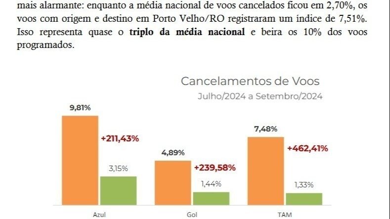 Conforme análise técnica, apresentada em gráficos e documentos anexados à ação, os índices de cancelamentos e atrasos chegam a ser 450% superiores à média nacional em certos períodos. Outro dado alarmante é o número de cancelamentos pela Azul Linhas Aéreas entre julho e setembro deste ano, que chegou a 10%, deixando milhares de pessoas com viagens frustradas sem quaisquer justificativas.