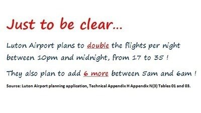 Night flights at Luton Airport are currently unregulated and affect far more people than at London City Airport, which has a night movements curfew. Planes from Luton Airport are much bigger, and there are plans to almost double the existing 8,500 night flights per annum. There are more night movements at Luton than at Heathrow. The World Health Organisation links noise disturbance at night to serious health problems. We are calling for a significant reduction in night flights at Luton Airport instead of the further increase which is being proposed.