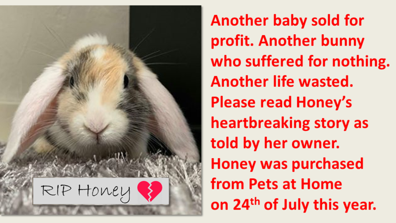 ‘Hi there, I read your story about Stella. My family and I were completely selfish and decided to go buy a rabbit from pets at home because this little girl caught our eye and instead of adopting we just decided to buy our rabbit since we were in love with her. She was extremely underweight when we bought her but I thought we could ‘rescue’ her and bring her weight back up. The first night she was barely eating. Like literally maybe one or two bits of hay. I was concerned but thought she might be stressed and I didn’t know if she was eating in her hiding spot when we were asleep but I thought I’d keep an eye on her just in case. I kept waking up every hour the first night to check on her and she was sat in between her food bowls the entire night, not lying down but just sitting. The next day my partner and my mum were at work so it was just me and Honey. And she was really quiet, didn’t mind being lifted up but it was quite concerning because there was nothing ‘rabbit’ about her. She was way too calm for a rabbit and was quite zombie like. Every hour she would run around for about 15 minutes and then just sit in the corner. Then she ended up getting diarrhoea and I rushed her to the vets. They did say she was underweight and her temperature was really low. So they kept her in for a few hours and I was so upset and crying hoping she would survive as they did say she might not make it as she’s so young and weak. Then they phoned me and said we could come and collect her as she’s back to eating and she’s starting to be normal again. So that night everything was going well. She was starting to run around and was eating a bit more and her droppings were looking normal. She was more lively and actually cleaning herself as well. Although we had to give her lots of medication but it was going well. The day after she was okay but then around 3pm she started acting weird again and wanted to hide and seemed off. I was so worried. But then she went to sleep for an hour and then that’s when she died. The vets was Vets4Pets that was attached to pets at home. She started crying out, like a very quiet cry and that’s how I knew. I grabbed her and we headed straight to the vets and when she had died in my arms we tried everything to bring her back but it didn’t work. Vets4Pets tried bringing her back as well but it was too late. We bought her on the 24th and she died the 26th of July. We only had her for two days but we fell so in love with her. It’s been two weeks but i still break down when I think about it. It has scarred me. Pets at home refunded us absolutely everything and they paid for the post-mortem and they’re paying for her urn. I’ve yet to hear back from them for the results to why she died. I can’t even describe the pain of losing her. But I’ve learned my lesson and I’ll definitely NEVER shop in pets at home again or shop anywhere for an animal. Everyone NEEDS to know that you should adopt instead. I hope my little Honey is finally happy and not in any pain. I thought I’d share this story as I know more and more people are saying the same thing so I hope to tell mine also.