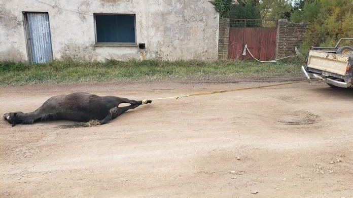 Un hombre en una camioneta llevó por las calles de la localidad a la rastra un caballo muerto atado de sus patas traseras.