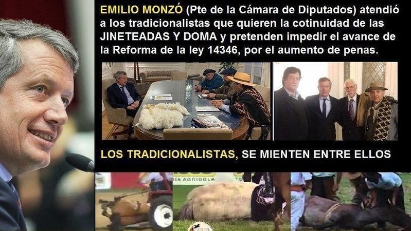El Presidente de la HCDN Dr. Emilio Monzó, se reunió en su despacho con referentes de agrupaciones tradicionalistas, a quien les trasmitió "que mientras el sea presidente de la Cámara la ley de protección animal que propone el aumento de penas contra los actos de maltrato y crueldad " esto transmitieron LOS TRADICIONALISTAS.
