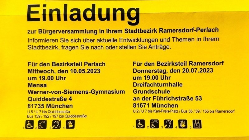 Morgen ist die Bürgerversammlung Perlach, bei der wir einen Teilerfolg erringen könnten. Ich habe einen Antrag eingereicht, der dieser Petition entspricht. Bitte kommen Sie zahlreich um sicherzustellen, dass der Antrag angenommen wird.