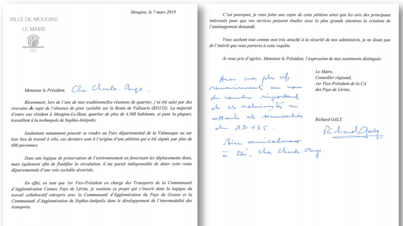 Je suis heureuse de vous annoncer que j'ai reçu hier de la part de la mairie une copie PDF de la lettre datée du 7 mars 2019 de la part de M. Galy Maire de Mougins (soit le lendemain de mon rendez-vous dans ses services) adressée à M. Ginesy, Président du Conseil Départemental des Alpes-Maritimes. Veuillez en trouver une copie d'écran de cette lettre ci-jointe. J'ai eu l'accord de la mairie pour transférer la lettre, donc elle est disponible sur demande via : klaire.thomas@gmail.com.