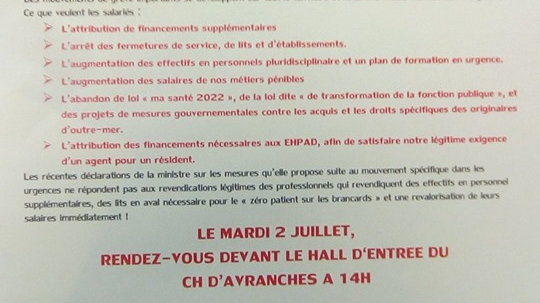 " plus de patients sur les brancards" : la grève continue sur le site du CHAG, vous êtes invités à soutenir les soignants ce mardi 2 juillet sur le site d'Avranches, la population vieillit mais les budgets pour la santé sont peau de chagrin. Les principales revendications sont : L’attribution de financements supplémentaires, l’arrêt des fermetures de services, de lits, d’établissements, l’augmentation des effectifs en personnels pluridisciplinaire et un plan de formation en urgence, l’augmentation des salaires de nos métiers pénibles, l’abandon de loi « Ma Santé 2022 », de la loi dite « de transformation de la fonction publique », et des projets de mesures gouvernementales contre les acquis et les droits spécifiques des originaires d’outre-mer, l’attribution des financements nécessaires aux Ehpad, afin de satisfaire notre légitime exigence d’un agent pour un résident. ». Covoiturage possible rdv à 13h15 de Granville (place du stade louis dior).