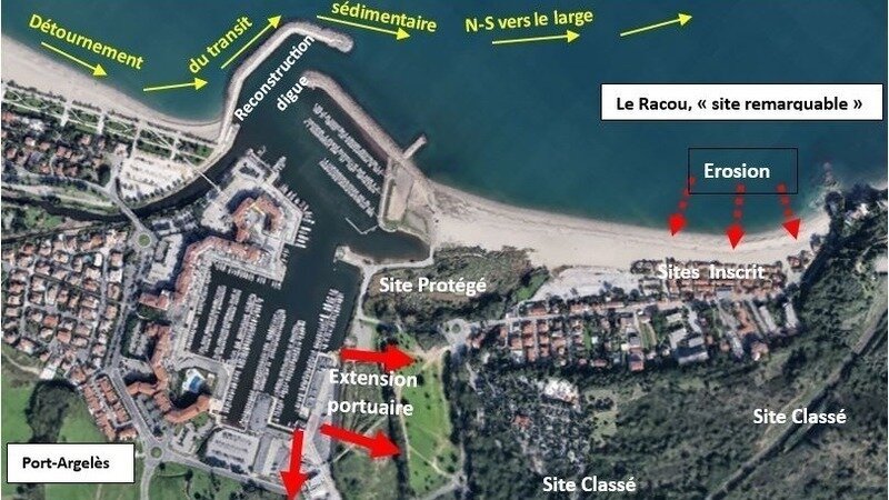 - Mais, refusant de prendre en compte les conclusions de l’expertise judiciaire et donc de protéger ce site emblématique du littoral catalan, la Mairie d’Argelès vient, en 2023, de reconstruire la digue portuaire responsable de l’érosion de la plage (10 millions €) sans la moindre étude d’impact environnemental préalable avant de déverser au Racou des milliers de m3 de déchets pollués de dragage portuaire en zone Natura 2000. Elle souhaite également agrandir le port et creuser un nouveau bassin vers le Racou (20 millions €) en modifiant le Plan Local d’Urbanisme. Au lieu de protéger le Racou et les espaces naturels environnants, elle annonce ainsi « lutter contre le réchauffement climatique » [sic] et protéger les bateaux en étant « le premier port français à réaliser un recul stratégique » [sic]. Il y avait les climatosceptiques, il y a aujourd’hui les climato-manipulateurs justifiant la bétonisation du littoral par la lutte contre le dérèglement climatique.