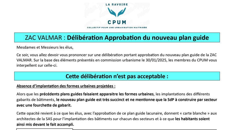 Lors du conseil municipal de ce Lundi 17 Fevrier 2025, l’équipe municipale s‘apprête à mettre au vote une délibération pour approuver le nouveau plan guide pour la ZAC VALMAR de La Ravoire.