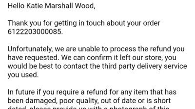 Then I received an email saying i won't being issued a refund as i had used a 3rd party to deliver my shopping which is false, I payed asda directly to deliver my shopping and asda have used a 3rd party to deliver my shopping, with that email I rang the customer service again to be told I should contact uber myself.