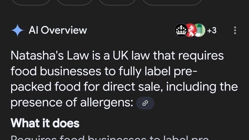 Natasha's Law is a UK law that requires food businesses to fully label pre-packed food for direct sale, including the presence of allergens: