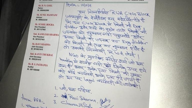 However, the RWA members and the residents have given a declaration in the police station that they will not stop anybody from feeding the dogs in the colony and will ensure that no harm is done to the dogs.