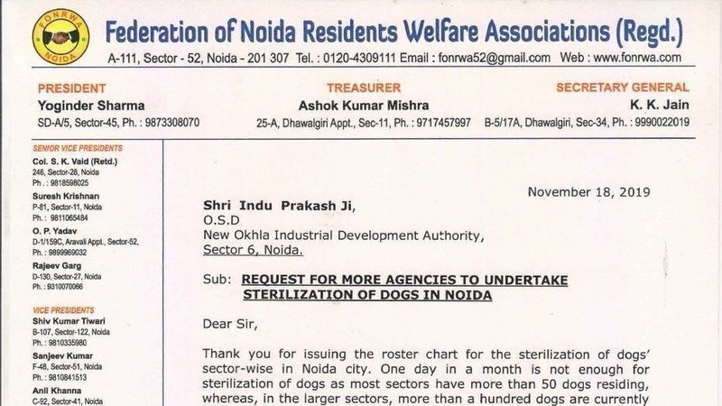 The Federation of Noida Residents Welfare Association has written a letter to the OSD, New Okhla Industrial Development Authority, Noida to open more Sterilization units as the stray dog population is quite high in the city of Noida.