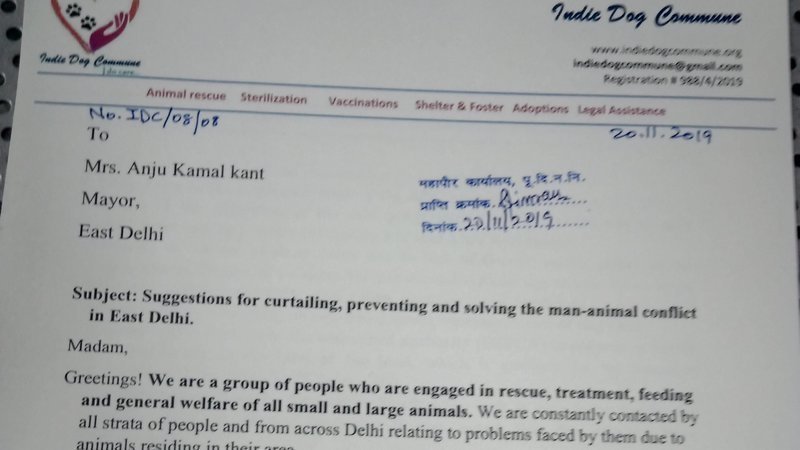 A letter asking for improvement in the ABC programme and various other dog related issues were given by the Indie Dog Commune an NGO which looks into cases of animal cruelty and tries to minimise them to the Mayor of East Delhi on 20th November 2019.
