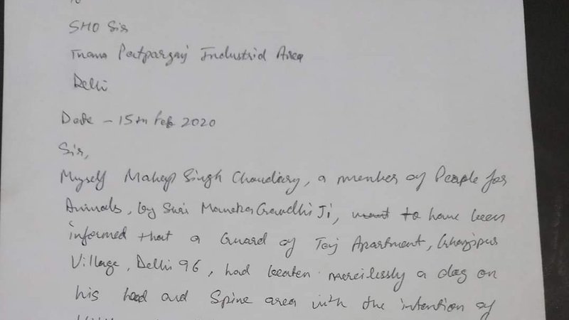 Meanwhile a written complaint against the security guard who had beaten the dog, the security agency for which he works and the president of the RWA on whose order the dog was beaten has been given to the SHO of the Anand Vihar Police station.