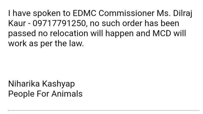 Meanwhile Niharika of PFA (people for animal) has confirmed that the Municipal Commissioner Ms. Dilraj Kaur has not given any such order and has given assurance that the MCD will work according to the laws and as per law there will be no dog relocation in East Delhi.