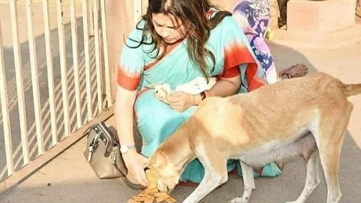 It was a pleasant surprise to watch the Member of Parliament from the New Delhi Constituency Meenakshi Lekhi feeding a stray dog that too with so much compassion. This is indeed a rear view (pic in the post). Feeding stray in India is not considered respectable. People often ridicule the feeders and find the whole exercise quite demeaning. People who feed not only face criticism and opposition but also face social stigma.