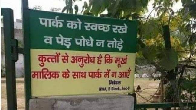 An RWA has come yet again with an obnoxious board. Right at the entrance of a park. The board says "Keep the park clean and do not pluck flowers and saplings. And requesting the dogs not to enter the park with their idiot owners" ( pic in the post). Below the board it's written RWA, Pocket B, Sector 8. Nothing can be more atrocious and insulting to a pet owner than what is written on this board. Such boards create negative mindset towards dogs and the people who take care of them. No wonder the caregivers are bullied and sometimes physically assualted for feeding the dogs.