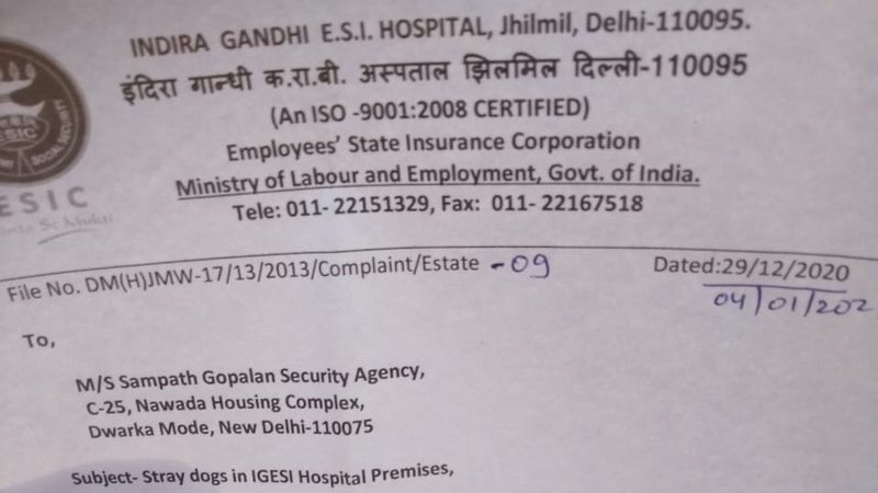 A letter got viral today which has been written by the Assistant Director (Estate) Indira Gandhi ESI Hospital in Jhilmil, East Delhi (pic in the post). The letter is addressed to the Security Agency who have deployed their security guards at the hospital. The letter says that many stray dogs walk in groups in the hospital premises here and there. The staff and beneficiaries of the hospital are facing problems because of them. The dogs have attacked their staff. Hence the agency is required to instruct their security guards to prohibit entry of stray dogs in the hospital premises. The letter has been issued with the approval of the Medical Superintendent of the hospital.