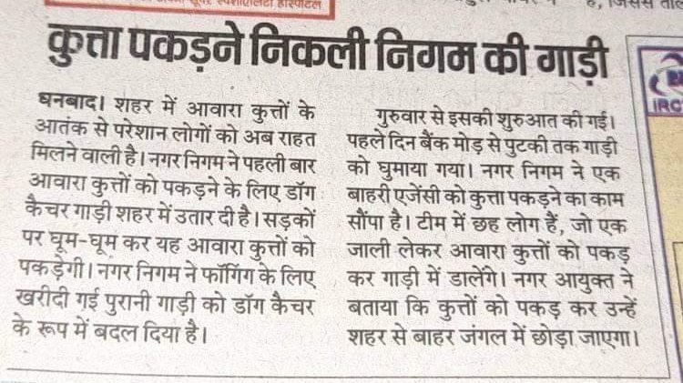 The municipal corporation of Dhanbad in Jharkhand have made a dog catching van and it's not for the purpose of sterilization. It's for catching the dogs from the city of Dhanbad and dumping them at the outskirts in jungle area. And this is being done by the orders of the municipal commissioner.