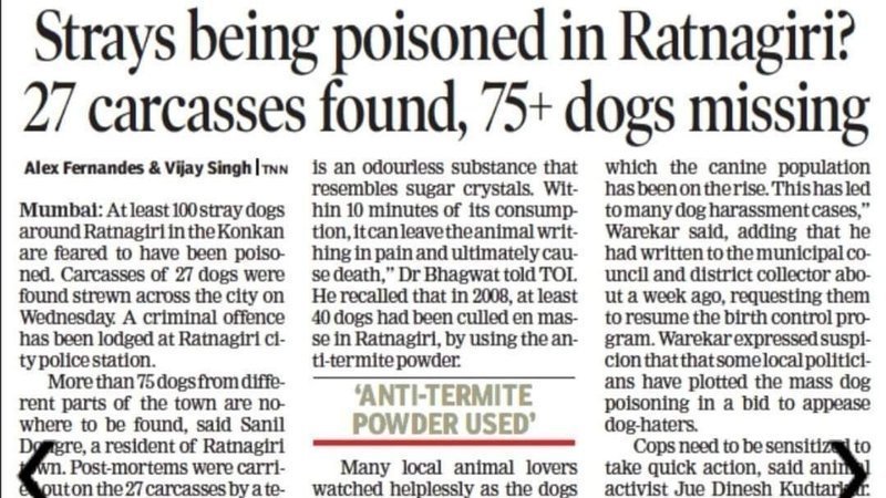 Around 100 dogs are missing and dead in Ratnagiri in Maharashtra. 80 of them have been poisoned. The caregivers are shocked and just can't believe their eyes. How can 100 dogs meet such a fate. Because few dog haters cannot dare to kill dogs in such large numbers. The district animal welfare officer Sainiket Wareker and the interim coordinator of Aam Aadmi Party Jyotiprabha Patil are filing a petition with the high court against the illegal killings of the dogs. In their petition they have mentioned several points and one of the points is regarding the promises made by the ruling party leaders during election time in 2016 where they promised to control dog population of their area. Well its again election time and it seems they did nothing to control dog population. There is no ABC unit and there is no infrastructure where the dogs can be sterilized. So obviously dogs have only multiplied over the years. So is this mass murder to woo their voters again?