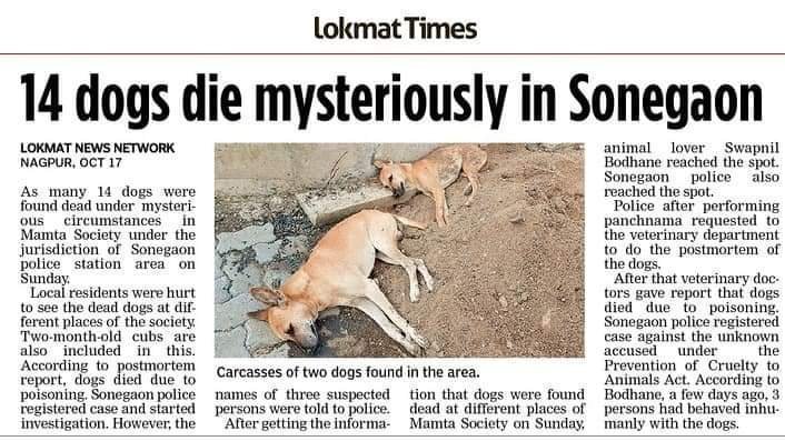 14 dogs were poisoned to death in Sonegaon, Nagpur, Maharashtra (Pic in the post). FIR has been lodged.