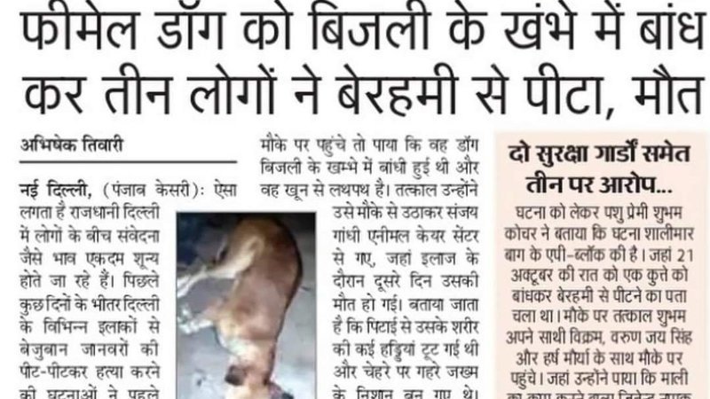 A female stray dog was tied to an electricity pole and beaten by three ruthless men in Shalimar, New Delhi (Pic in the post). The dog had given birth to small puppies just few days back. The animal lovers untied the dog who was bleeding profusely and took her to Sanjay Gandhi Animal Care Centre. The dog died the very next day. A complaint has been lodged against the culprits but it seems the police has not yet taken any action against the culprits. For details of the case kindly go on the link below: