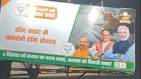 A huge hoarding has been put in Delhi which has the photo of the Prime Minister along with two other BJP leaders and it says that the dog shelters will save from dog bites (Pic in the post).