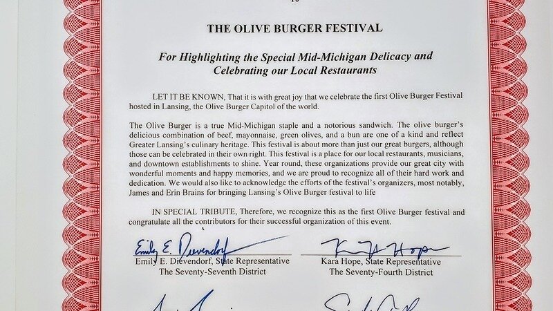 While the bulk of this tribute is just recognizing the Olive Burger Festival, it does reference us as the Olive Burger Capital of the World. We're taking the win! Thank you to everyone who signed the petition and helped get the attention of our state lawmakers. And, of course, thank you to the state lawmakers for making it so!