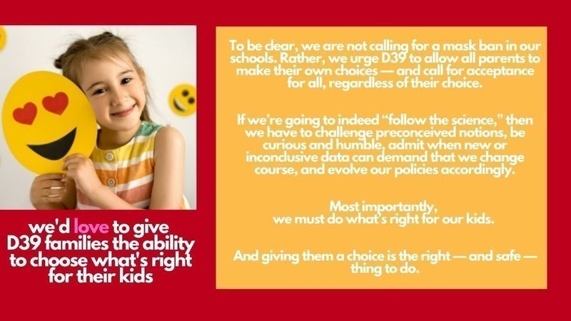 To be clear, we are not calling for a mask ban in our schools. Rather, we urge D39 to allow all parents to make their own choices—and call for acceptance for all, regardless of their choice.