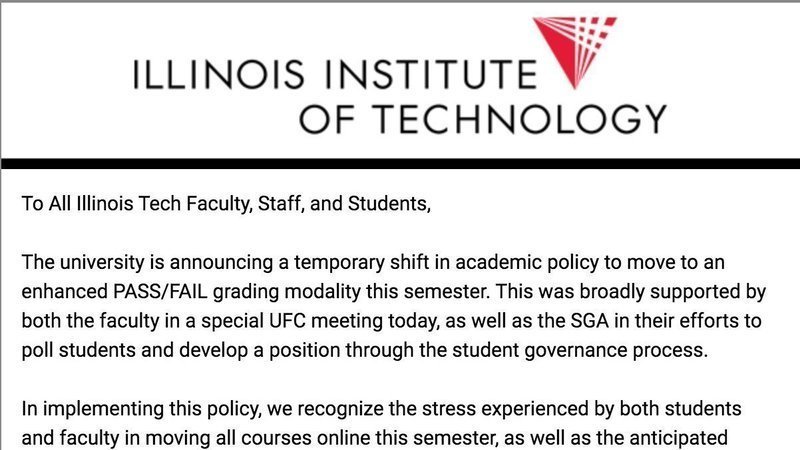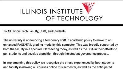 The Office of the Provost has announced that classes for the current semester (Spring 2020) at the Illinois Institute of Technology will now be administering Pass-Fail grading. The only exceptions available are for graduating seniors or students whose academic standing is in question. The absence of letter grades for this semester will greatly impact students applying for graduate and professional degree programs this application cycle. Students who were high-achieving for the portion of the semester that has already been completed are now losing their ability to show grade-improvement as their success will not be reflected in their transcripts (and, frankly, many students would have no need to return to coursework this semester if they will already receive a "Pass" grade due to academic excellence in midterm examinations).